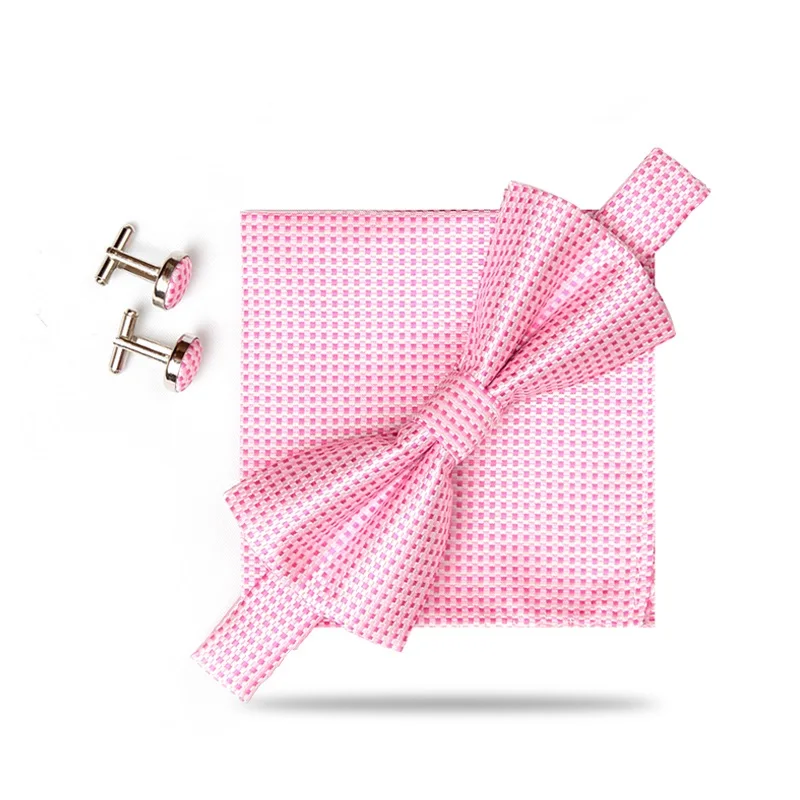 L’ensemble se compose d’un nœud papillon, un mouchoir de poche et une paire boutons de manchette.